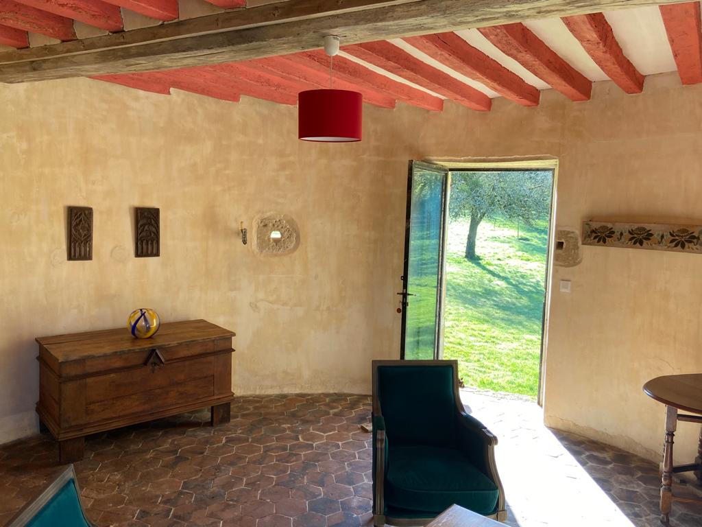 Le rez-de-jardin côté piscine. C’est un salon de 25 m2. Une porte donne directement accès au jardin et à la piscine. Une fenêtre ouvre sur le manoir.