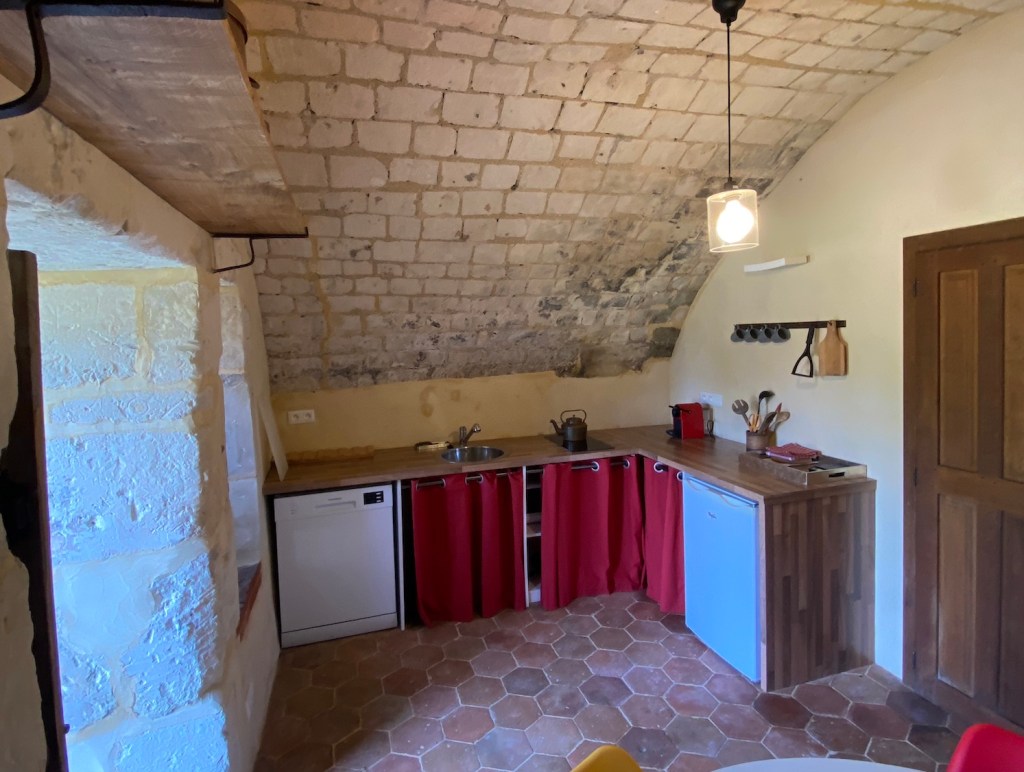 Côté manoir. Une cuisine aménagée. Une salle de douche et des WC séparés. A l’arrière de ces pièces débute un exceptionnel passage sous terrain qui conduit à la tour d’escalier.